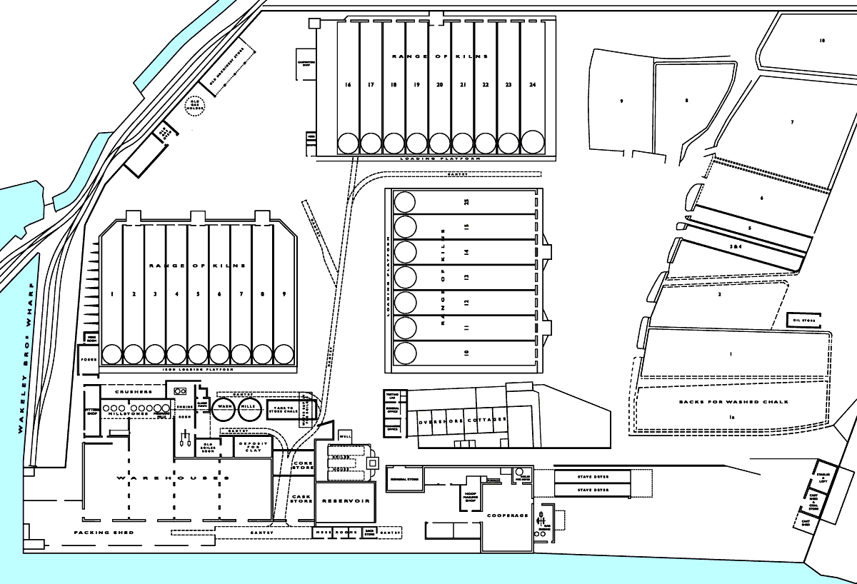 The site took only 2.954 acres. It included the existing Overshore Cottages. Part of the quay was taken over for the cement plant, but the brickworks retained tramway access to the wharf. The site included 10 of the 20 existing settling ponds built for the brickworks, and at least some of these were used to store chalk slurry. The chalk quarry was also on Wakeleys land to the south (there is no chalk near the quay), and it appears that the chalk was from the outset slurried at the quarry. The use of the settling ponds as slurry backs suggests that this must, at least at first, have been very thin slurry.