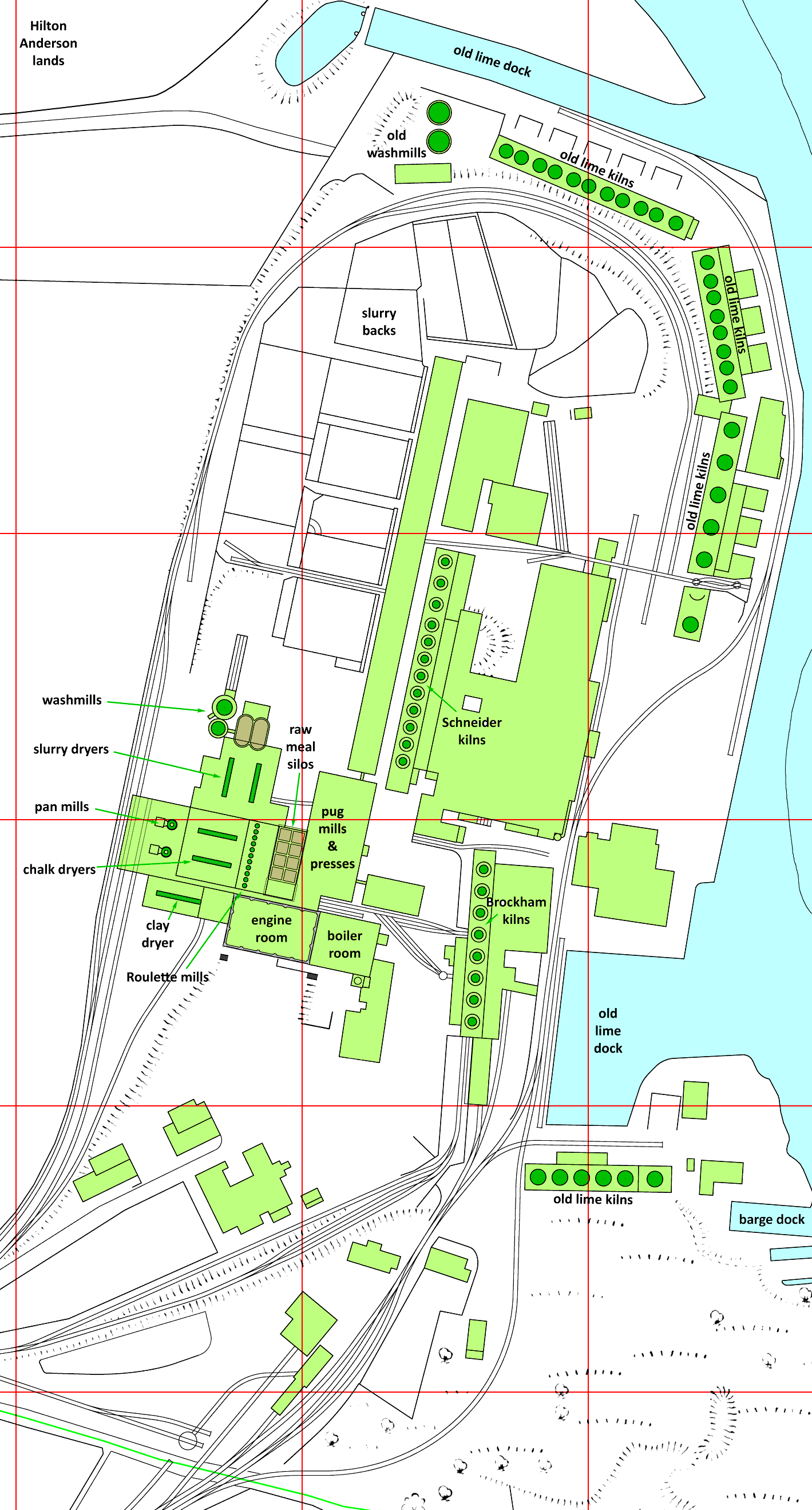 In 1911 with the BPCM takeover, the remaining bottle kilns were decommissioned, and in 1913 the Schneider kilns were converted to forced draught operation with capacity 1829 t/week at 4.80 MJ/kg (plus 3.00 MJ/kg for raw material drying). Its operations were combined with those of the adjacent Halling Manor after 1911. Capacity was 1600 t/week in 1924; the plant shut down during WWI, and ran only intermittently thereafter. The plant was described in detail in the BPCM 1924 schedule. The site had 250 m of wharf and two loading docks on the Medway, but also had a rail link from the inception of the Medway Valley line in 1856, thus enjoying flexible transportation throughout its life. The plant remained formally open until 1930, but does not seem to have produced clinker after 1925, although lime and whiting production continued for a while. Its closure was at the insistence of Henry Horne, whose own Holborough plant, adjacent to the south, was just starting up. The site was cleared and is now mostly waste land in which a few insignificant remains are visible. The quarries are also waste.