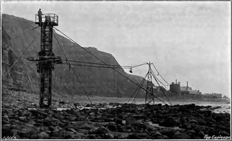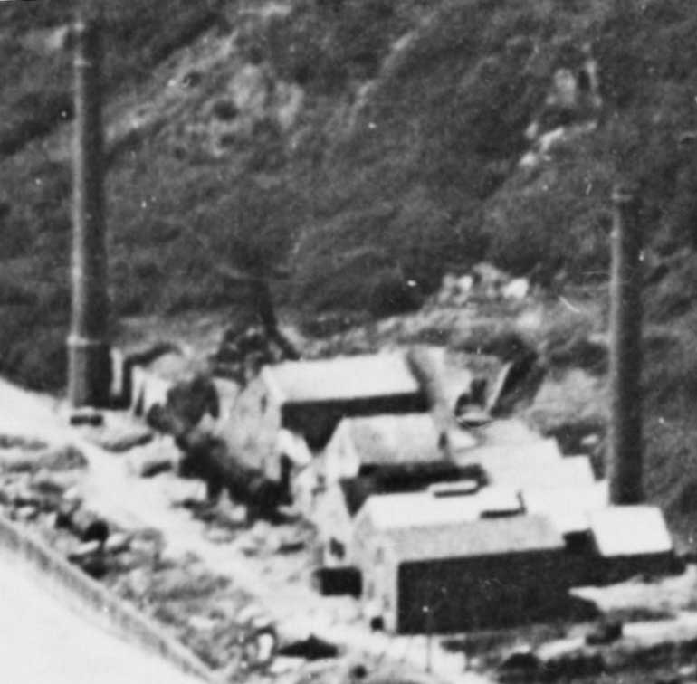 Fig. 3 - Single Cable Ropeway, Lyme Regis Cement Company. This gives a view from the far (southwest) end of the ropeway, towards the plant and the Cobb. The second and third OS map revisions were before and after the existence of this equipment, but the intermediate pylon is tentatively shown on the 1925 1:2500 map. The dimensions given here allow them to be plotted with reasonable accuracy.