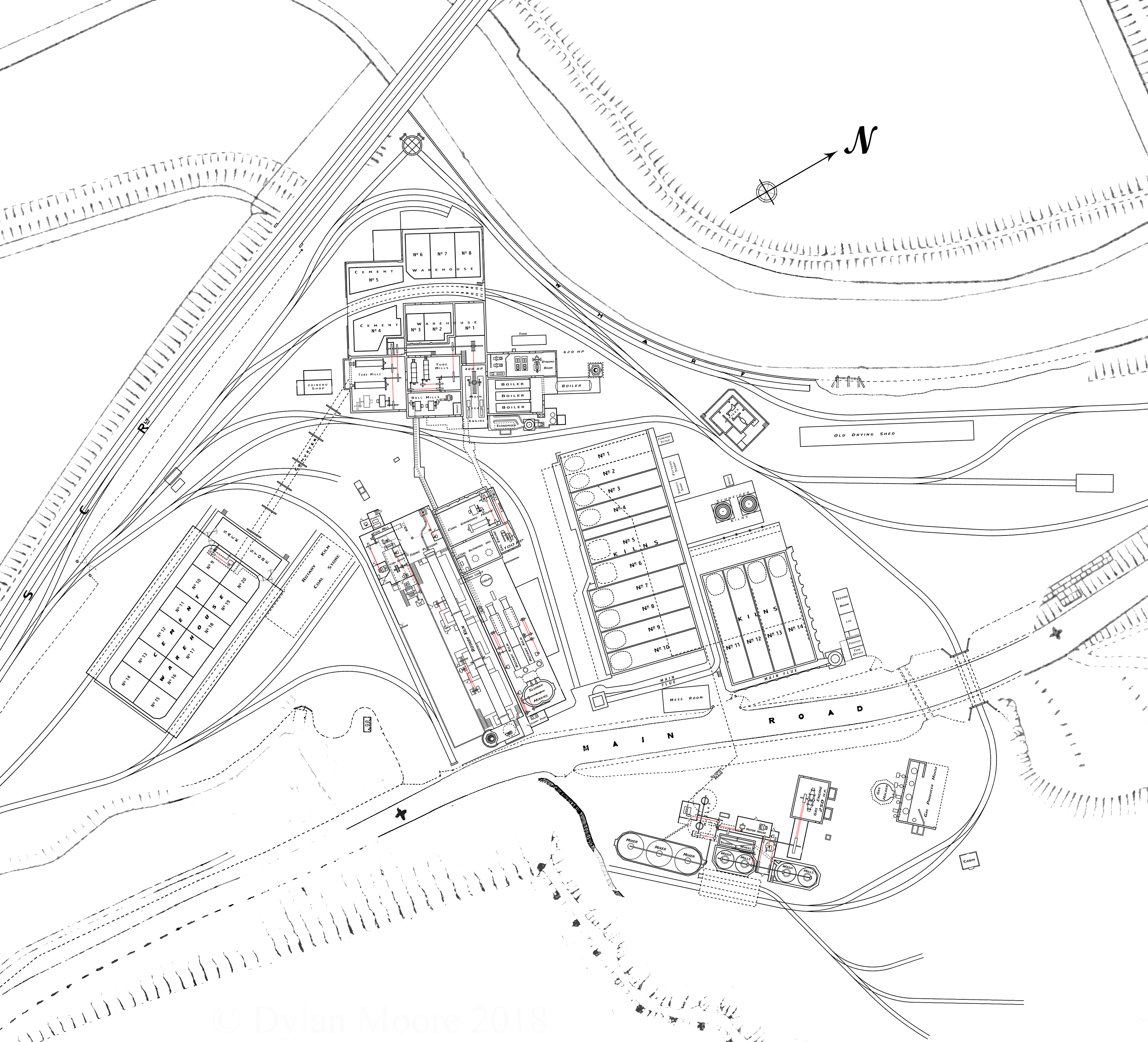In the reconstruction of the Shoreham Works, which are situated at Beeding, the Company were able to allow for many improvements which it was found impossible to adopt at Newhaven, and here the processes are carried out upon what are recognised as absolutely the most modern lines. An exceptional advantage of the Shoreham works is that they are situated on the banks of the river Adur. The result of this is that the Company are able to despatch their cement and receive coal, coke, and other supplies in their own barges by water. The clay for use in the works is brought by barge from the Company's own freehold clay-pit at Horton, about three miles from the works. The unloading is effected by means of a steam crane. One of the cement stores is built on the wharf so that the cement can be loaded into the barges direct from the store. There is a considerably larger face of chalk here, but it is cut out and conveyed to the works on a tramway in exactly the same way as at Newhaven. There is a gas-making plant for driving the gas engines; and on the side of the cliff from which the chalk is being cleared a new washing plant and wet mill, which will be driven by a 250 h.p. gas engine is in course of erection. The process followed as to the chalk and clay is similar to that at Newhaven, but the washing and mixing plant is more elaborate owing to the more modern methods of burning, which require different methods of washing to achieve the same chemical result. At Shoreham there are two washmills and two mixers instead of one of each, so that if one breaks down the other is ready to go on. The new wet plant which is being put up will also be duplicated. The present plant is not sufficient to deal with the larger burning plant without working night and day, and it is the Company's intention to avoid this if possible.