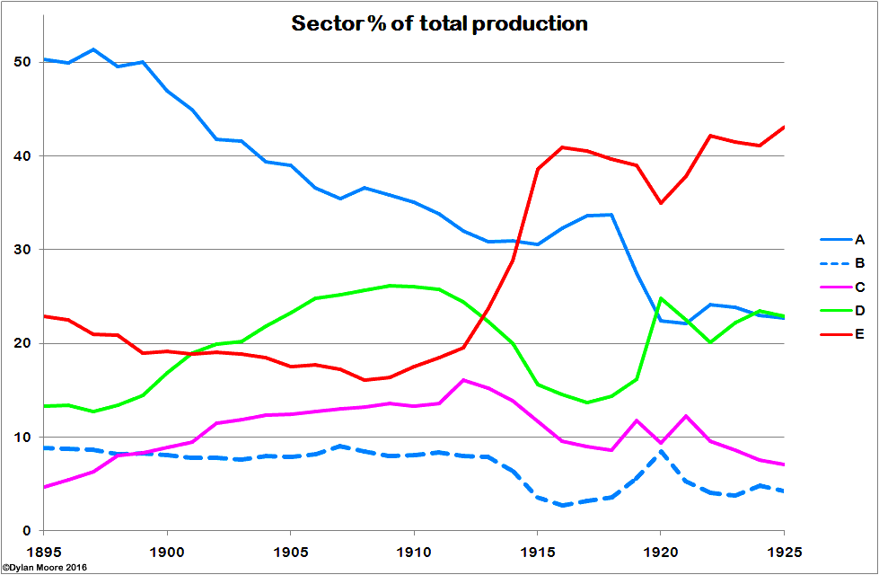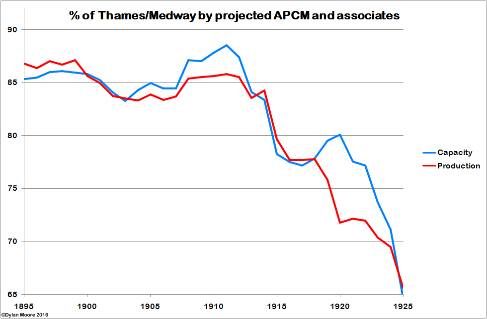 Actual production was characterised for APCM by a rapid growth in the period leading up to its formation, probably partly an artifact of the contract terms for the participants, followed by a period of tactical retrenchment. After 1912, the independents' expanded modern capacity achieved higher utilisation than the other sectors.