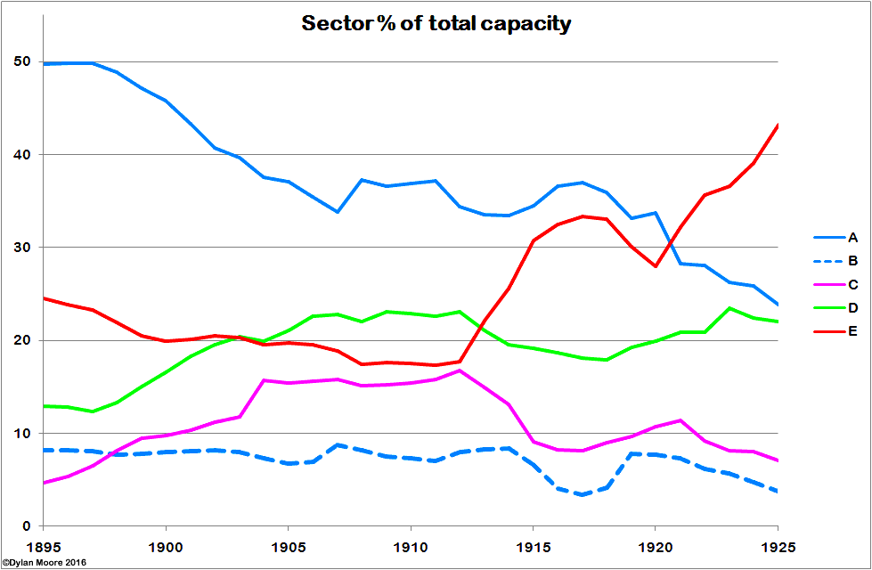 In capacity, APCM (A) continued to develop through the first decade, its relative size diminishing mainly because of the faster development of the firms (B, C and D) that subsequently made up BPCM. After the formation of BPCM in 1910-12, there was sluggish growth in the combine, while the independents (E) began at that time a very rapid growth which diluted the combine's share to around 60% - essentially its share for the next 70 years.
