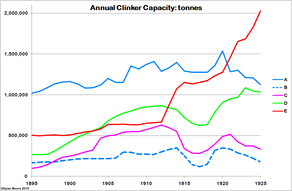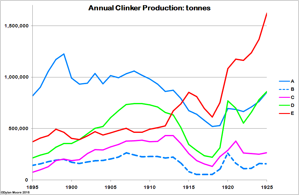 It is interesting in retrospect to look at the actual data on capacity and output during this period. The cementkilns database contains data on clinker production and capacity. These differ slightly from cement data depending on the proportion of other components added to the cement, the only legitimate one being at this time gypsum (Note 9). Gypsum was only added at plants with rotary kilns, and at these, addition rates were less than 2% originally, rising to 2.5% by 1925, so the effect is small. The database data are in tonnes, and can be aggregated into the five sectors as above: