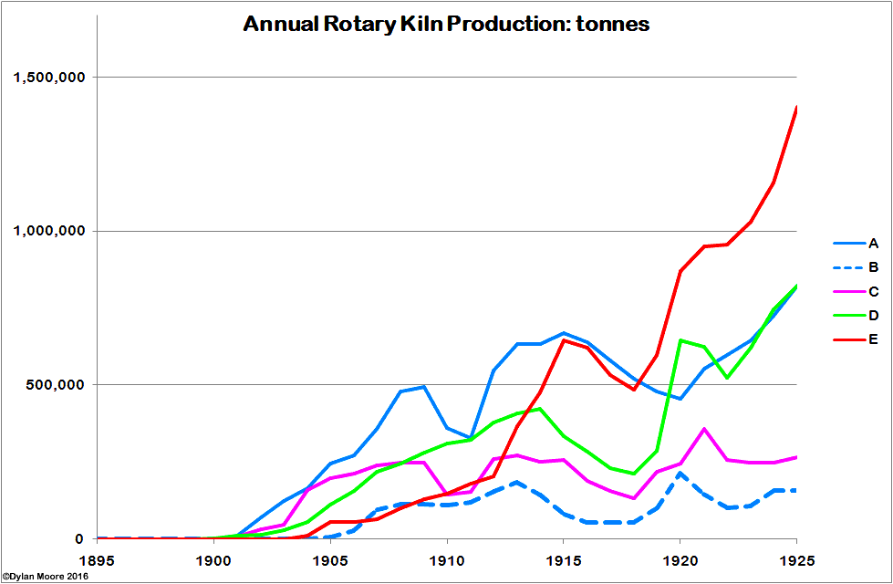 Installation of rotary kilns was the main disruptive change during the period. Rotary output was as follows: