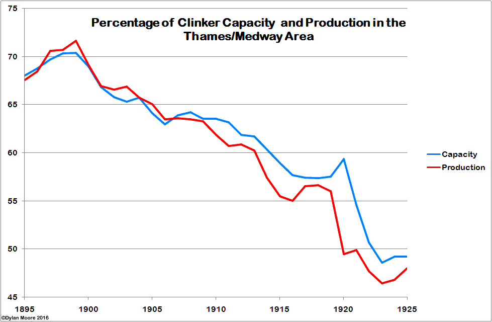 It is interesting to re-examine the original assumptions discussed above in terms of the database information. Firstly, the claim that "upward of 80 per cent. of the entire output of Portland Cement in the United Kingdom is produced on the Thames and Medway". This underlay the proposition that control of the Thames/Medway industry was sufficient to control the whole national industry (Note 10).