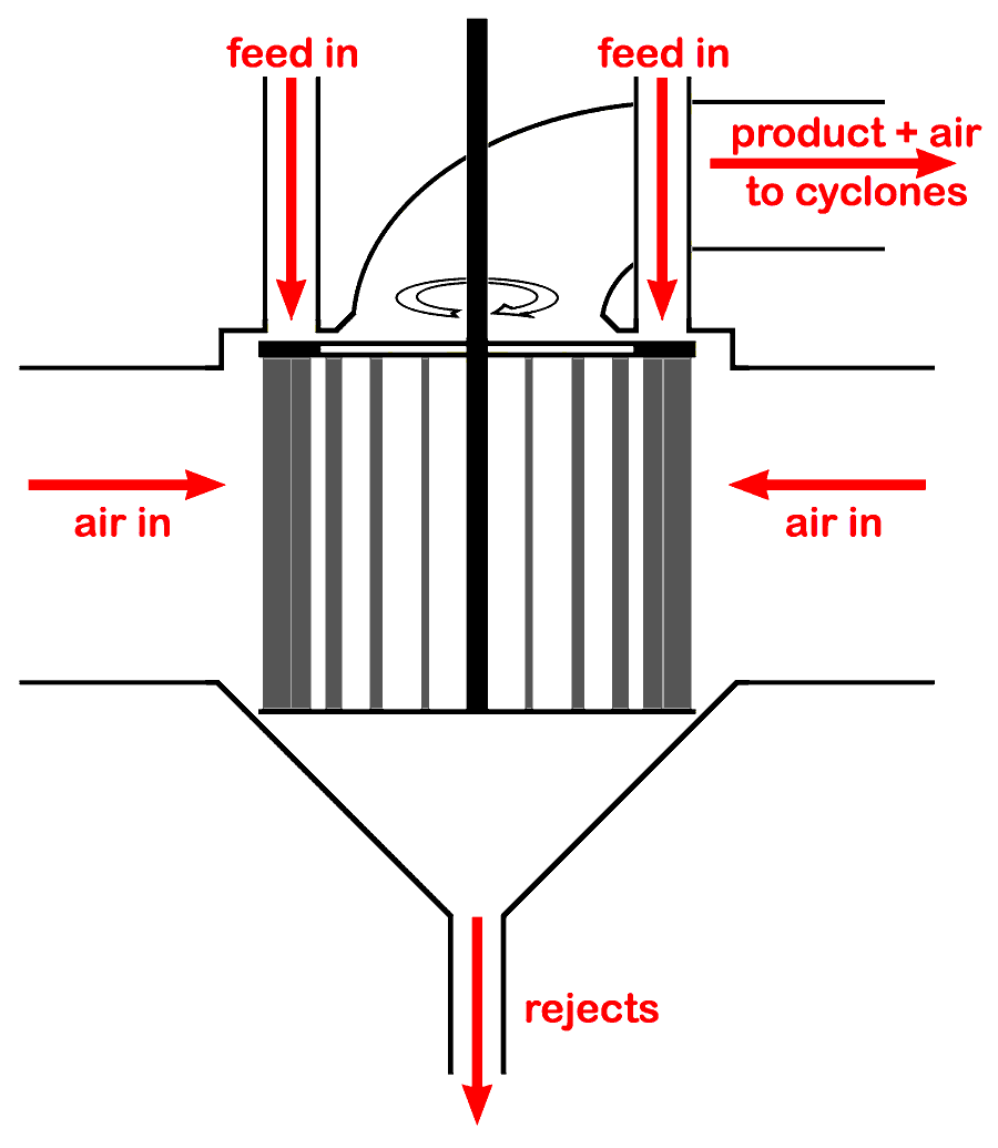 The Double Rotator® was the design supplied by Polysius, and used at Cauldon, Weardale, Aberthaw, South Ferriby, Cookstown and Rugby. Although in theory hot kiln exhaust gas could be used to heat the mill, only the Aberthaw mill did this. The Rugby mill uses cooler exhaust gas, and all the others used separate furnaces to generate hot drying air. The design has the advantage that both first- and second-chamber product pass through the separator, so that softer components that grind finely in the first chamber are removed and avoid over-grinding, while the second chamber can be graded to deal with the harder components only. At Cauldon, Weardale and Cookstown, the mill was preceded by an Aerofall mill and performed only regrind duty.